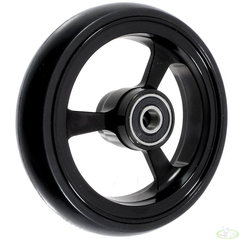 Lekkie i eleganckie kółko przednie do wózków inwalidzkich wykonane z aluminium. Trwała (niepompowana) opona z utwardzanej i odpornej na ścieranie gumy. W komplecie znajdują się również łożyska 608.2RS.