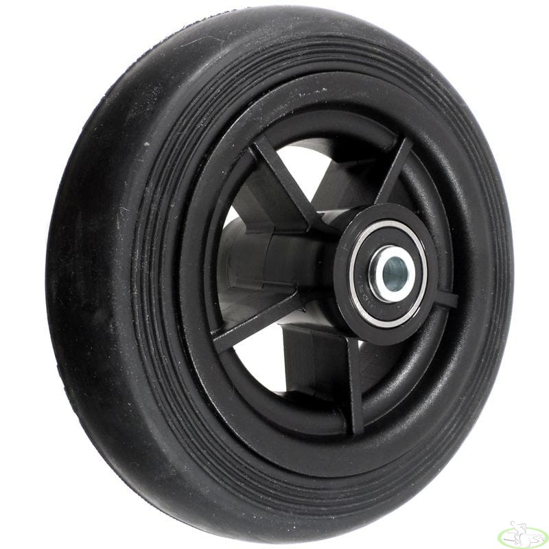 Lekkie kółko przednie do wózków inwalidzkich wykonane z wytrzymałego plastiku. Trwała (niepompowana) opona z utwardzanej i odpornej na ścieranie gumy. W komplecie znajdują się również łożyska 608.2RS.