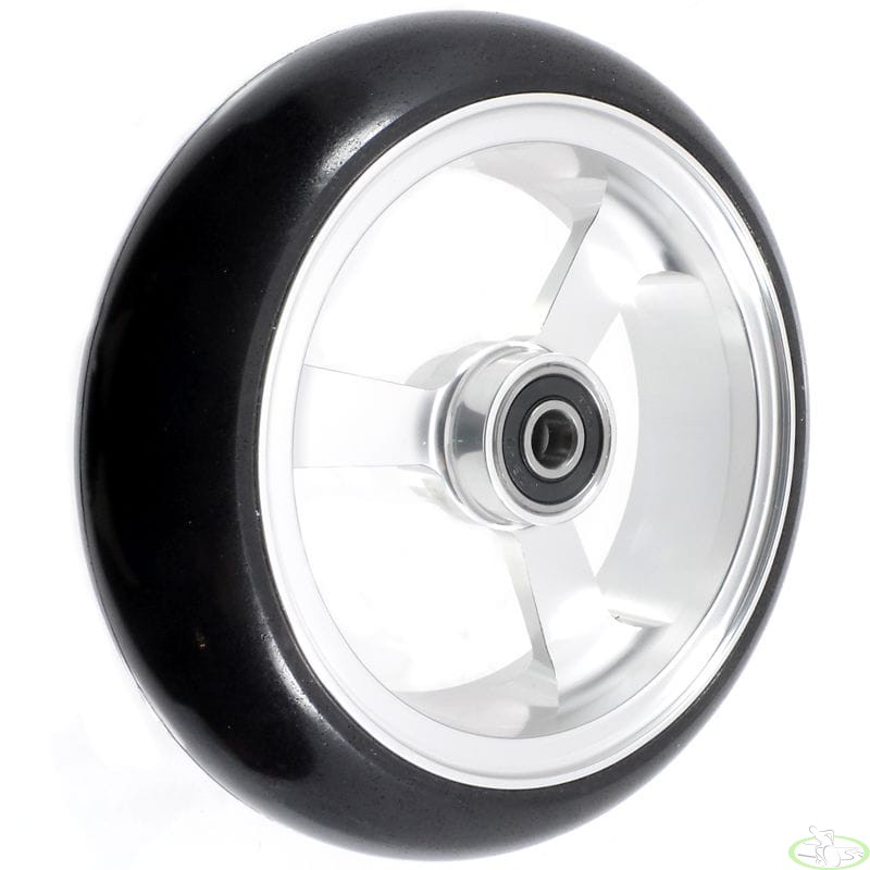 Легкое и изящное переднее колесо для инвалидной коляски, выполнено из алюминия. Прочная (ненакачиваемая) покрышка изготовлена из закаленной износостойкой резины. В комплект входят подшипники 608ZZ.