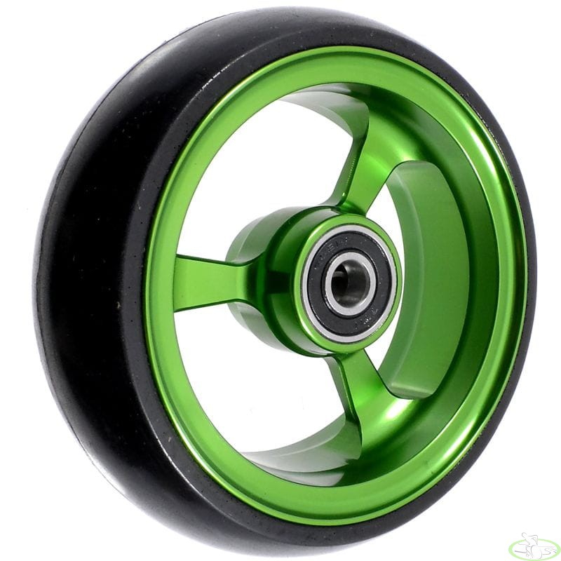 Легкое и изящное переднее колесо для инвалидной коляски, выполнено из алюминия. Прочная (ненакачиваемая) покрышка изготовлена из закаленной износостойкой резины. В комплект входят подшипники 608ZZ.